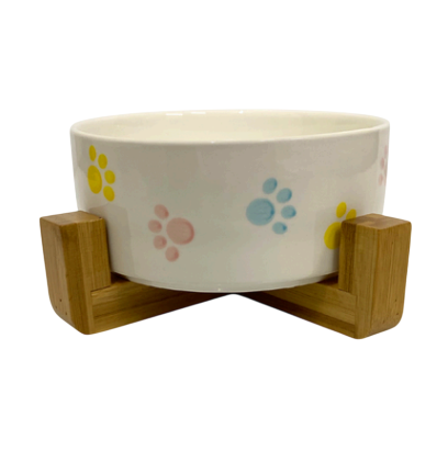 Comedero de cerámica con base de madera que ayuda a mantener la estabilidad del plato.